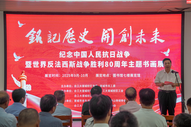为深切缅怀抗战英烈、弘扬伟大抗战精神,激发广大青年学子爱国热情和民族使命感,由宣城校区党委、宣城市关工委联合主办的“铭记历史 开创未来”纪念中国人民抗日战争暨世界反法西斯战争胜利80周年主题书画展开幕式于9月18日在宣城校区展览馆举行。宣城市关工委主任丁绍东、宣城市关工委常务副主任沈伟,宣城校区党委副书记、管委会主任蒋传东,校区党委副书记、管委会常务副主任方留,校区纪委书记葛万锋,校区管委会副主任李友良等出席开幕式。